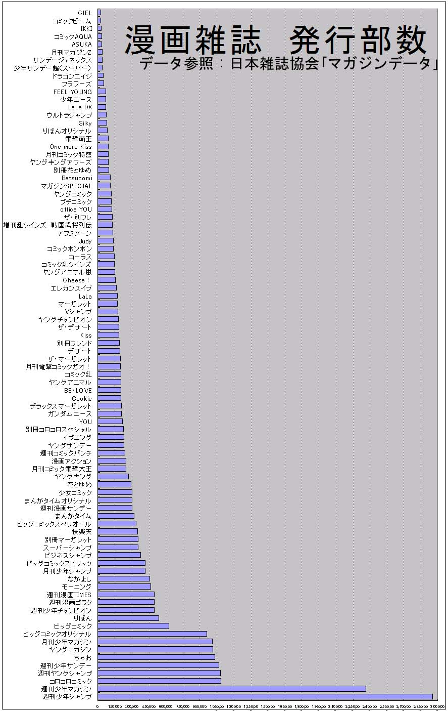 ちなみに42万部はグラフを見てもらえればわかるんですが、『モーニング』『なかよし』『ビックコミックスピリッツ』と同じぐらいの発行部数です。おいらが毎月買ってる『ウルトラジャンプ』の発行部数が少ない! しかし『ウルトラジャンプ』はジワジワと上がってくるぜ!『無職王ニィト』になるんだったら、『UJ』でやってくれればいいのにな。しかし、「圧倒的じゃないか!?」とアムロの声が聞こえてきそうな、『週刊少年ジャンプ』の発行部数。恐ろしいぜ。