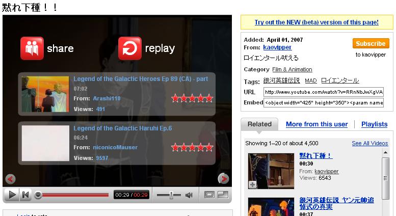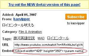この赤○で囲まれたソースを、ブログのソースに書き込むだけでOKです。『コスプレイヤー@本屋さんのブログ』は忍者ブログなので、編集ページのソースというボタンを押せば、そのエントリーのソースが表示されるので簡単なのですが、ヤプログはどうなってるのか不明です。ただ、あろえさんの『ぶろぐあろえ』でYou Tubeの動画を貼り付けたエントリーがあったので可能なはずです。